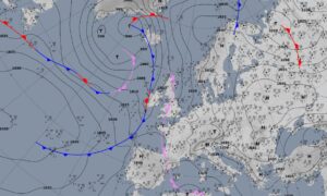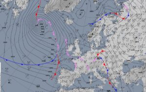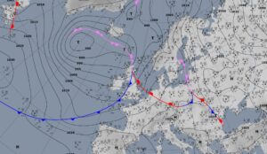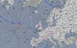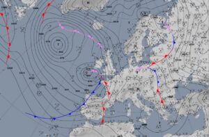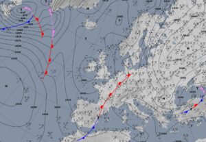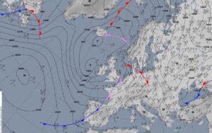 De weerkaart komt geleidelijk aan een klein beetje in beweging, maar grootschalig blijven we toch nog altijd dezelfde verdeling zien. Een hoog boven Rusland dat zich daar eigenlijk min of meer handhaaft. Het heeft uitlopers tot boven Scandinavië. Op de oceaan zien we lagedrukgebieden die niet echt door geraken omdat het hoog teveel weerstand biedt. Ook in de Middellandse Zee zitten lagedrukgebieden met storingen en hoewel die niet echt fors uitgebouwd zijn, zorgen ze daar wel lokaal voor erg slecht weer. Voor ons wordt vandaag een laag nabij Ierland van belang dat een storing met regen door onze regio stuurt waarbij minder koude lucht arriveert. Op de kaart toont dat zo: