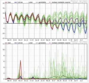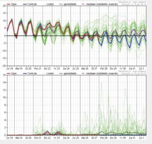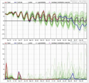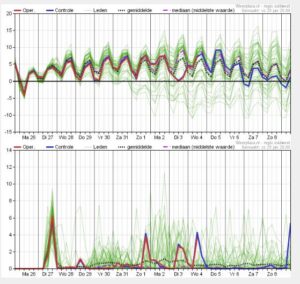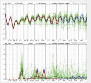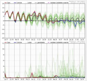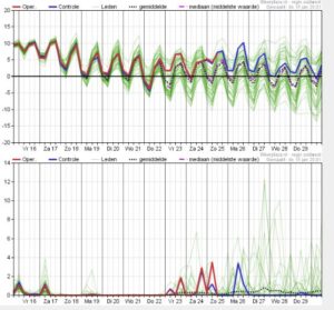 De komende dagen verandert er eigenlijk ook niet zo heel veel aan de heersende luchtdrukverdeling. Wij blijven in onze regio in vrij zachte lucht zitten die geleidelijk zachter wordt, maar de koude kan zich handhaven boven het noorden en oosten van Europa en zit écht dicht bij. Het noorden van Nederland blijft zeker nog enkele dagen in de koude lucht zitten met winterse taferelen terwijl daar bij ons echt niets van te zien is. De pluim is zacht en blijft die zachtheid tonen op termijn, maar als je goed kijkt zie je toch enkele (erg) koude lijntjes. Die blijven er steeds in zitten en van tijd tot tijd tonen ook andere modellen of de operationele run dat eens, maar het blijft steeds maar bij enkele berekeningen. Dat negeer ik voorlopig nog altijd. We gaan uit van een verdere verzachting al loopt dat de eerste dagen traagjes en niet altijd zo vlot en moeten we toch steeds een klein schuin oog op die koude blijven richten die echt niet ver zit …